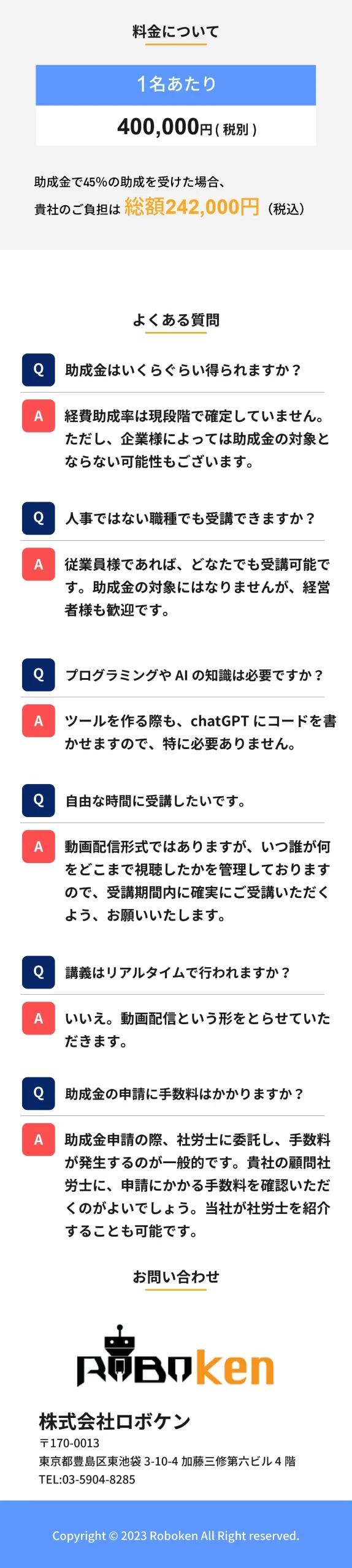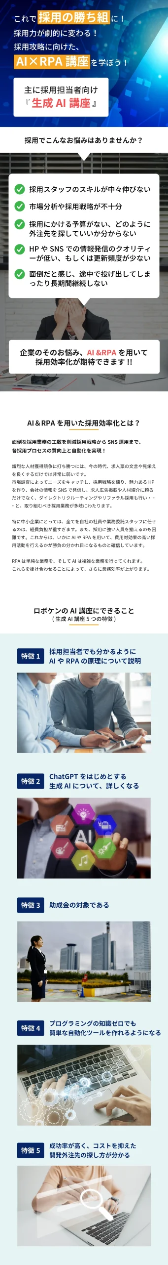 株式会社ロボケンが展開する「生成AI講座」の採用担当者向けLPを、デザインからコーディングまで一貫して制作しました。