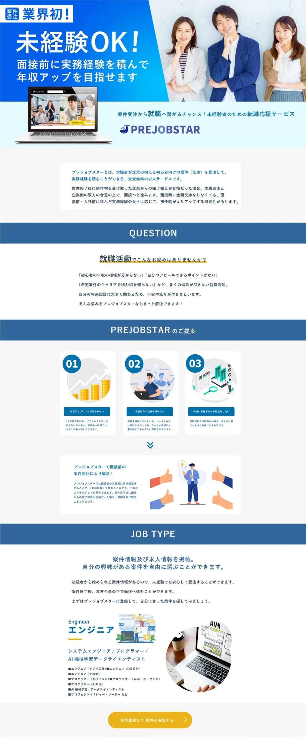 株式会社ロボケンが展開する「PREJOBSTAR」のユーザー向け広告LPを、デザインからコーディングまで一貫して制作しました。