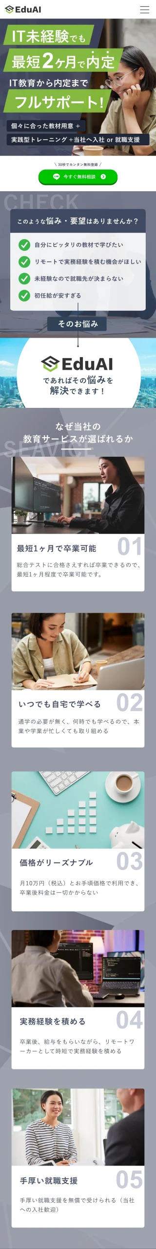 株式会社ロボケンが展開する「EduAI」の個人ユーザー集客用広告LPを、デザインからコーディングまで一貫して制作しました。