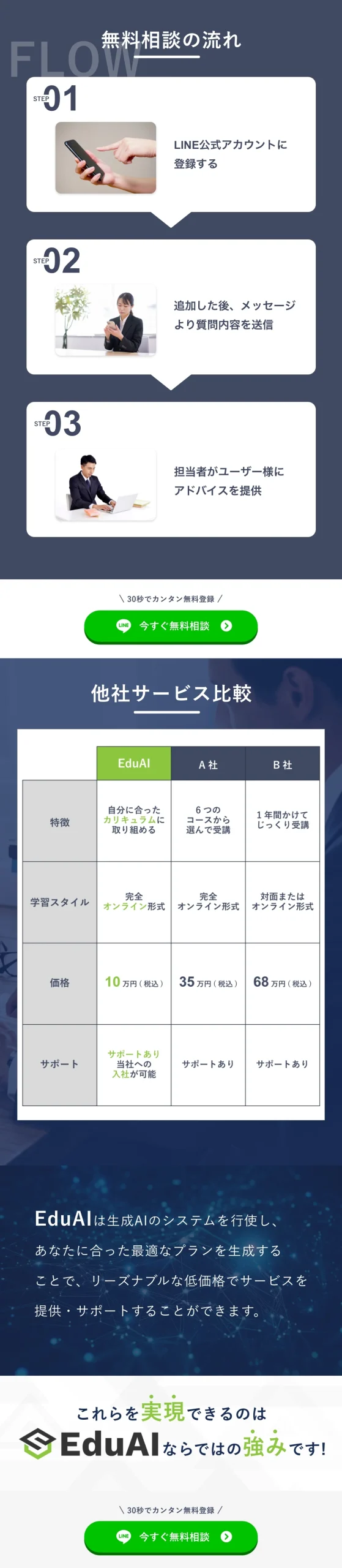 透明感のある印象を持たせるため、白を基調としたデザインにし、メインカラーは青みのあるグレー、アクセントには緑を使用しました。全体的に落ち着いた雰囲気に仕上げるとともに、LINE登録を目的に各工程へCVボタンを配置し、ユーザーの視認性を高めています。